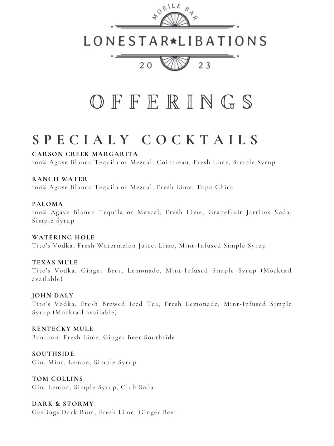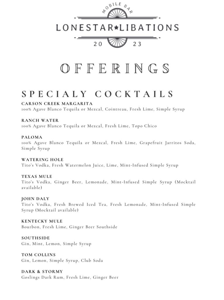 All of our cocktails are made with fresh ingredients and are served over a beautiful pecan wood slab serving station.